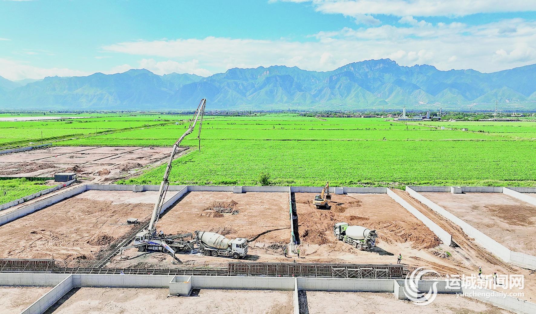 7月27日,工人在永济市农田退水治理工程项目建设现场作业。