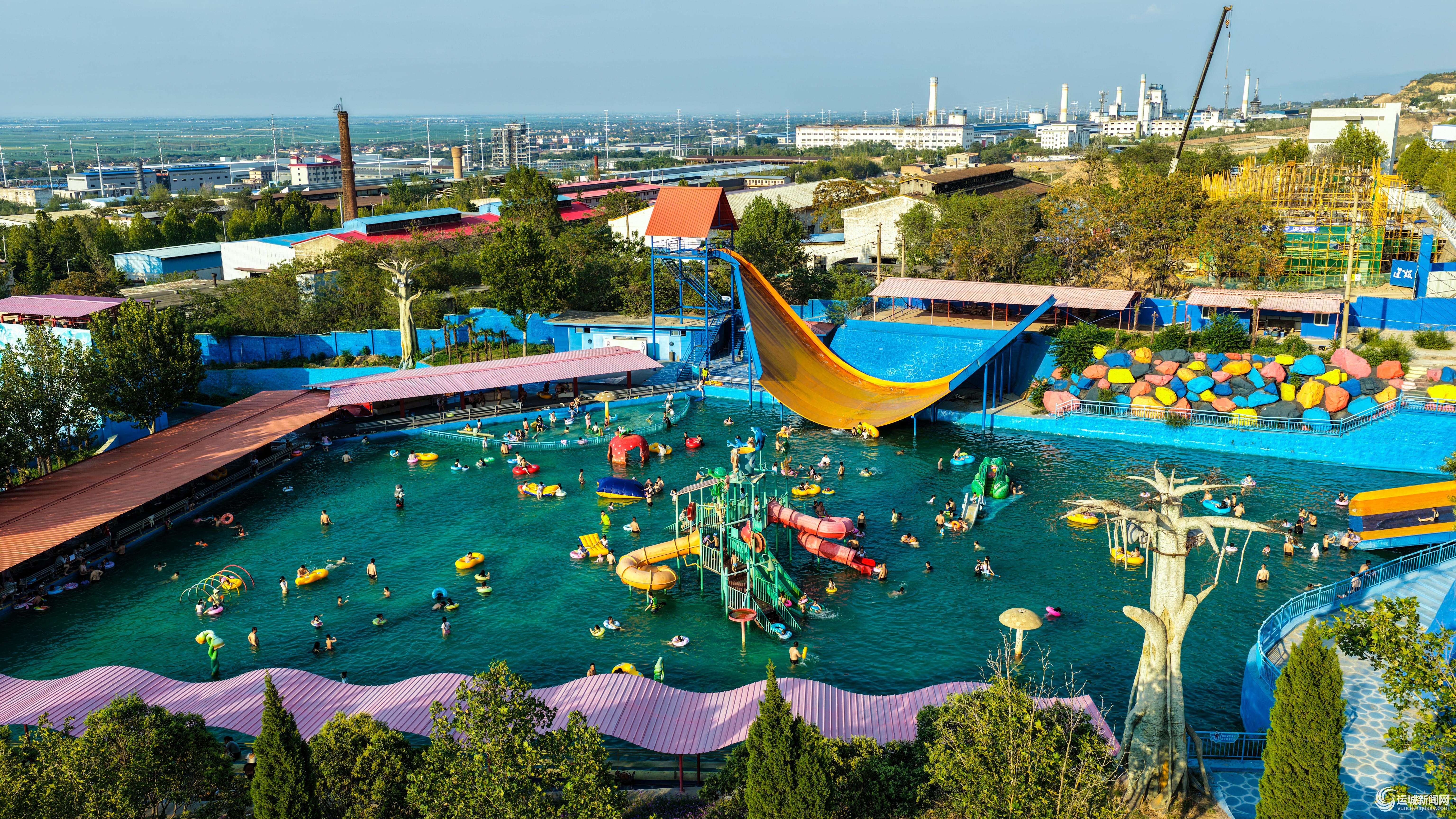7月29日,永济市雪花山下一水上乐园里,许多市民带着孩子在这里游泳、玩耍,尽享清凉夏日。