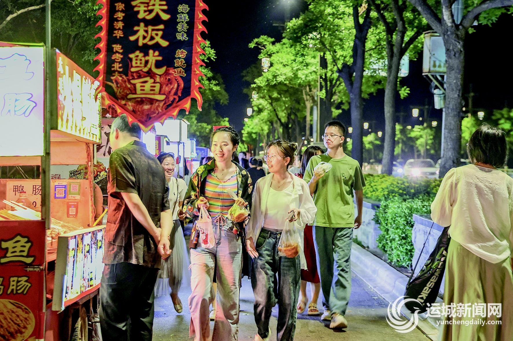 “冰镇啤酒+小龙虾套餐特惠”“特色冰粉”“雪花酪”……各色促销招牌在灯光下格外醒目。带着孩子逛街的朱女士正扫码购买一份水果捞:“晚上凉快些,带孩子出来逛逛,吃点小吃,比在家吹空调有意思多了。”