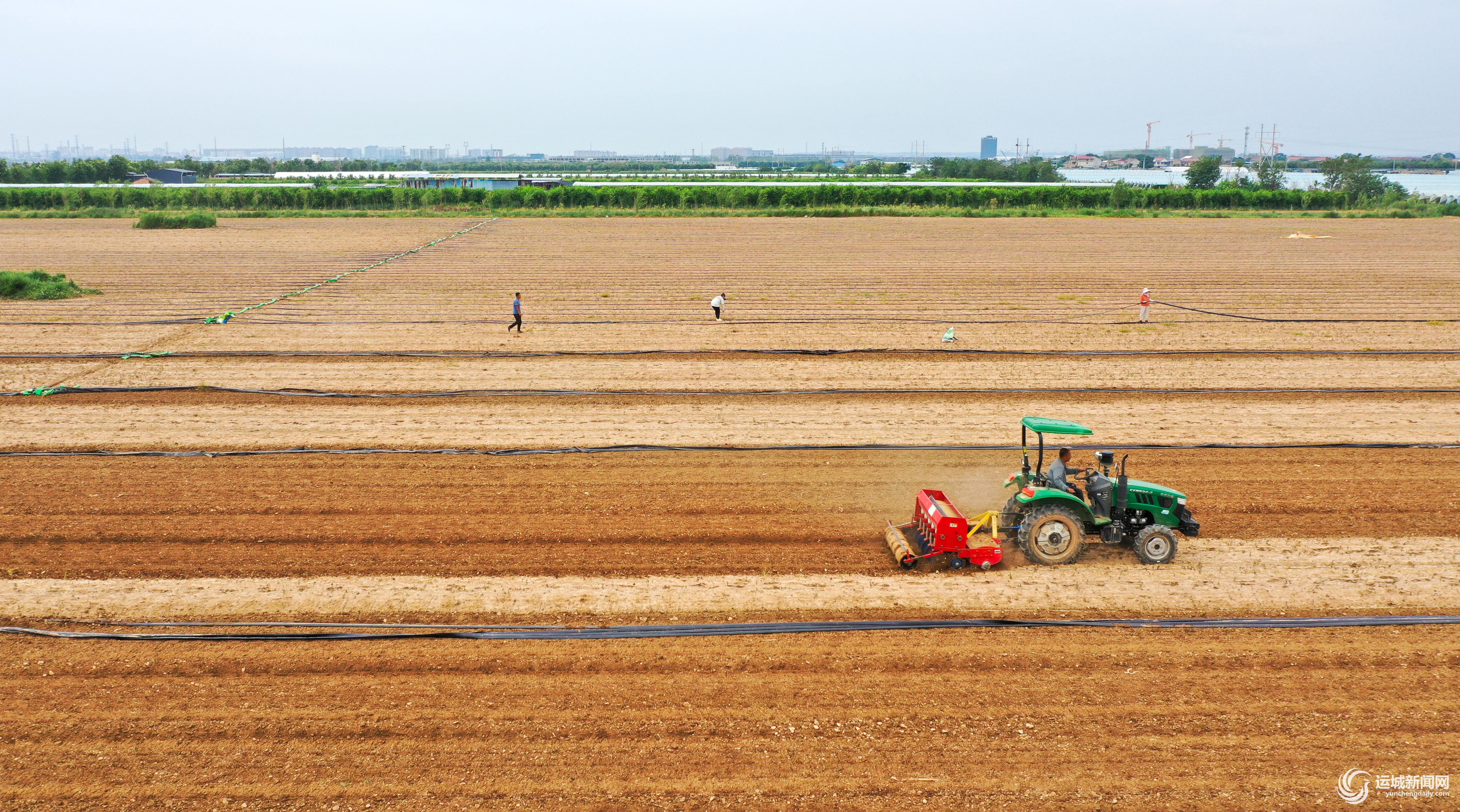 农场,员工驾驶农机正在播种二茬香菜。