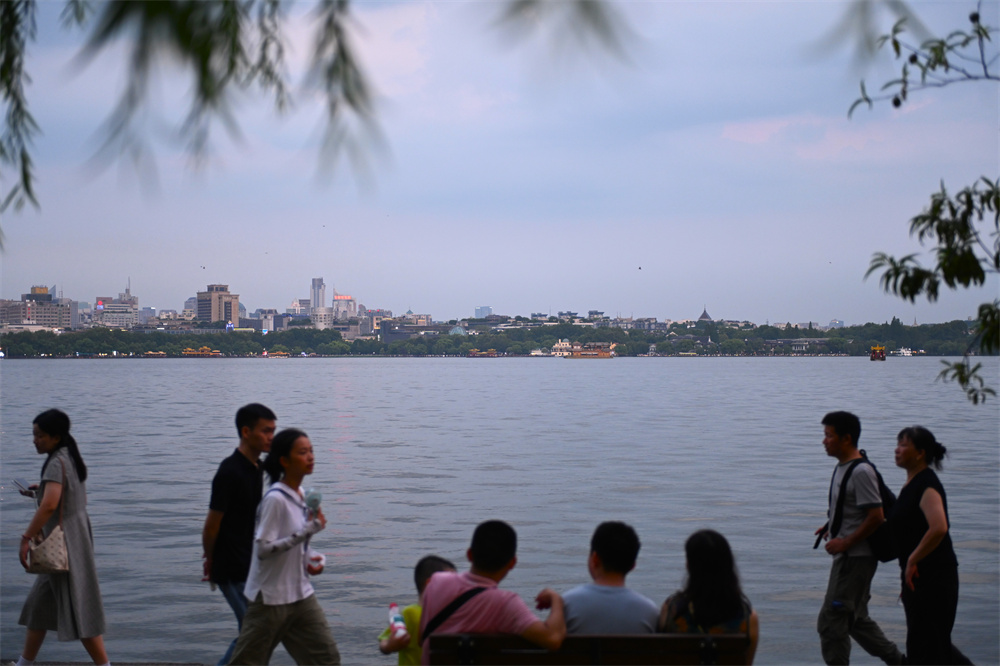 8月3日,游客在杭州西湖白堤休闲赏景。时值暑期旅游旺季,杭州西湖景区游人如织。 新华社记者 毛 竹 摄