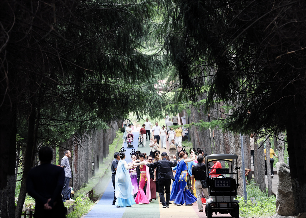 7月28日,在新疆乌苏佛山国家森林公园内,游客在消暑观光。 新华社发(兰红光 摄)