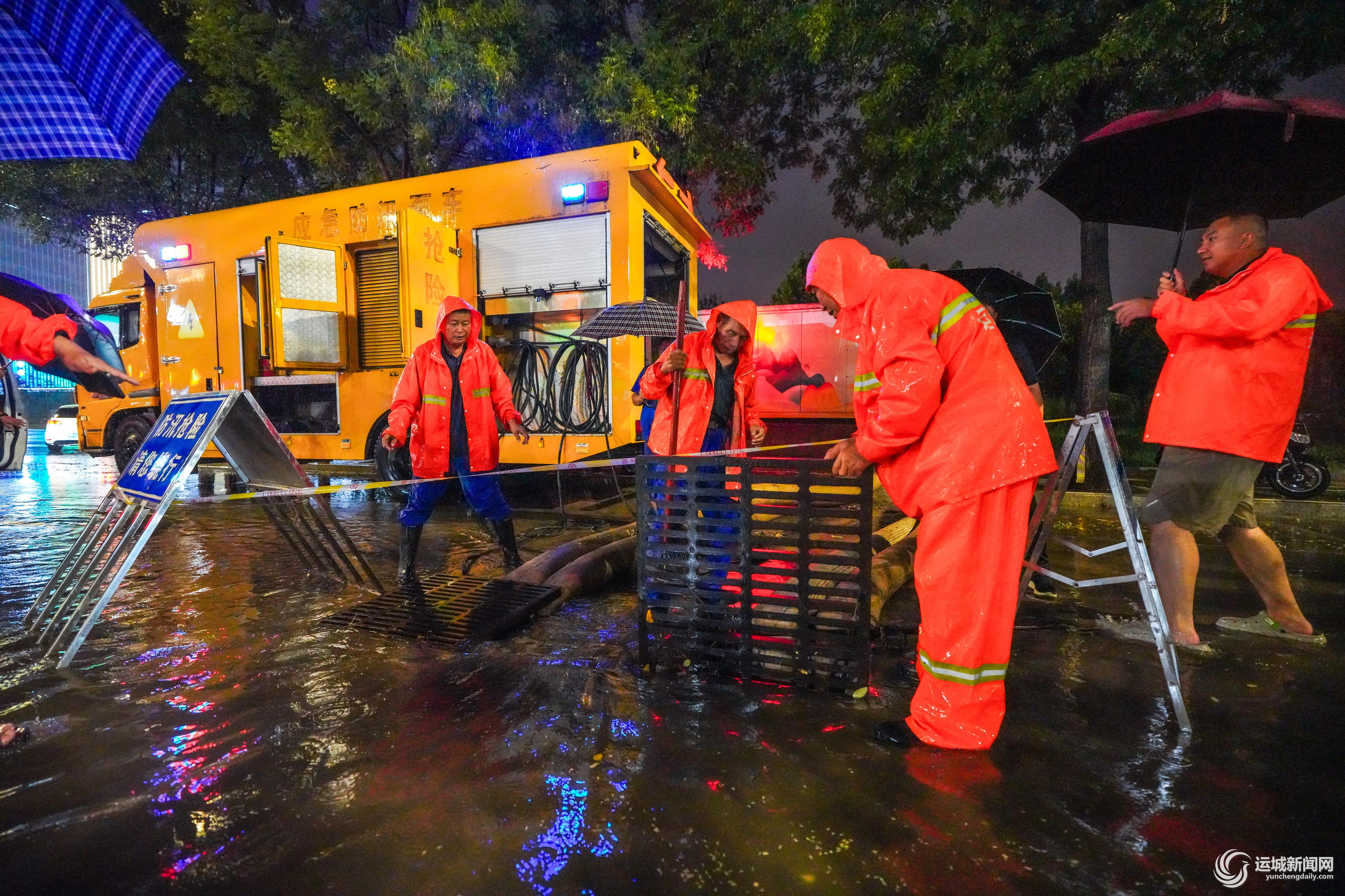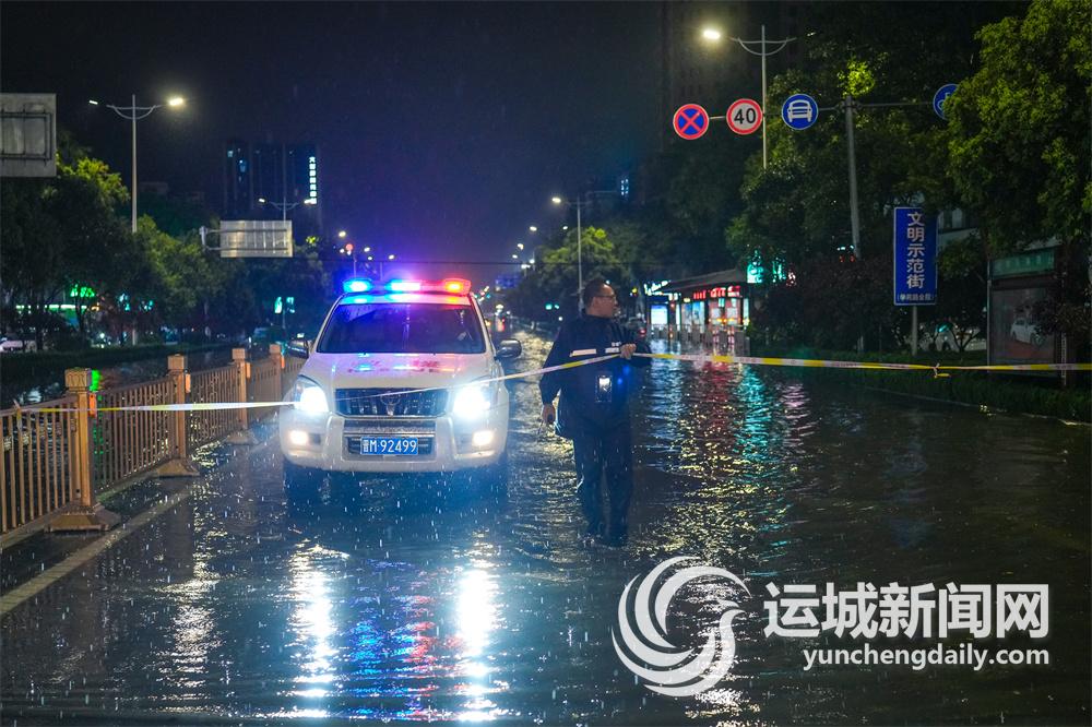 强降雨来临后,市应急救援大队第一时间到达中心城区学苑路立交桥北侧路口、舜帝街下穿侯平高速(运三段)立交桥下易积水点,设置警示牌,引导过往车辆和行人绕行。