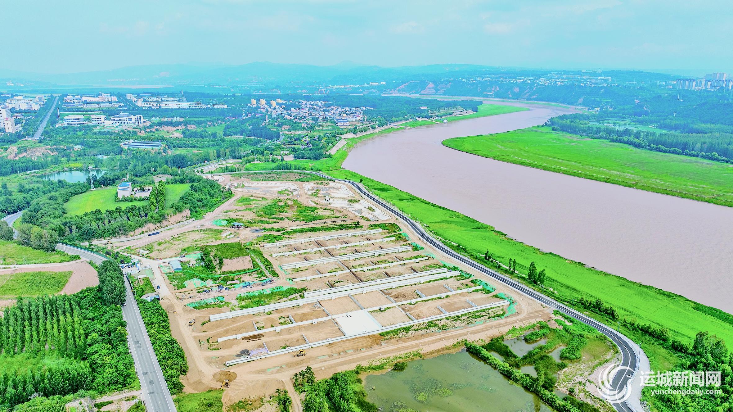 ▲8月8日,黄河流域平陆干流段水环境综合治理工程人工湿地施工现场,施工机械有序作业(无人机拍摄)。