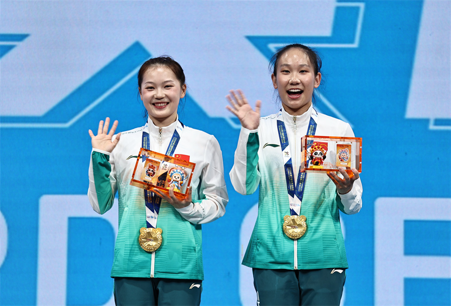 8月10日,冠军中国组合胡译乘(左)/张欣欣在颁奖仪式上,二人都来自山西队。