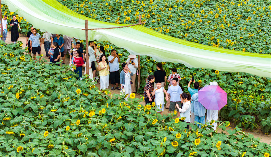 8月12日,游客在河南省驻马店市西平县老王坡产业融合发展示范区的百亩油葵花海游玩。