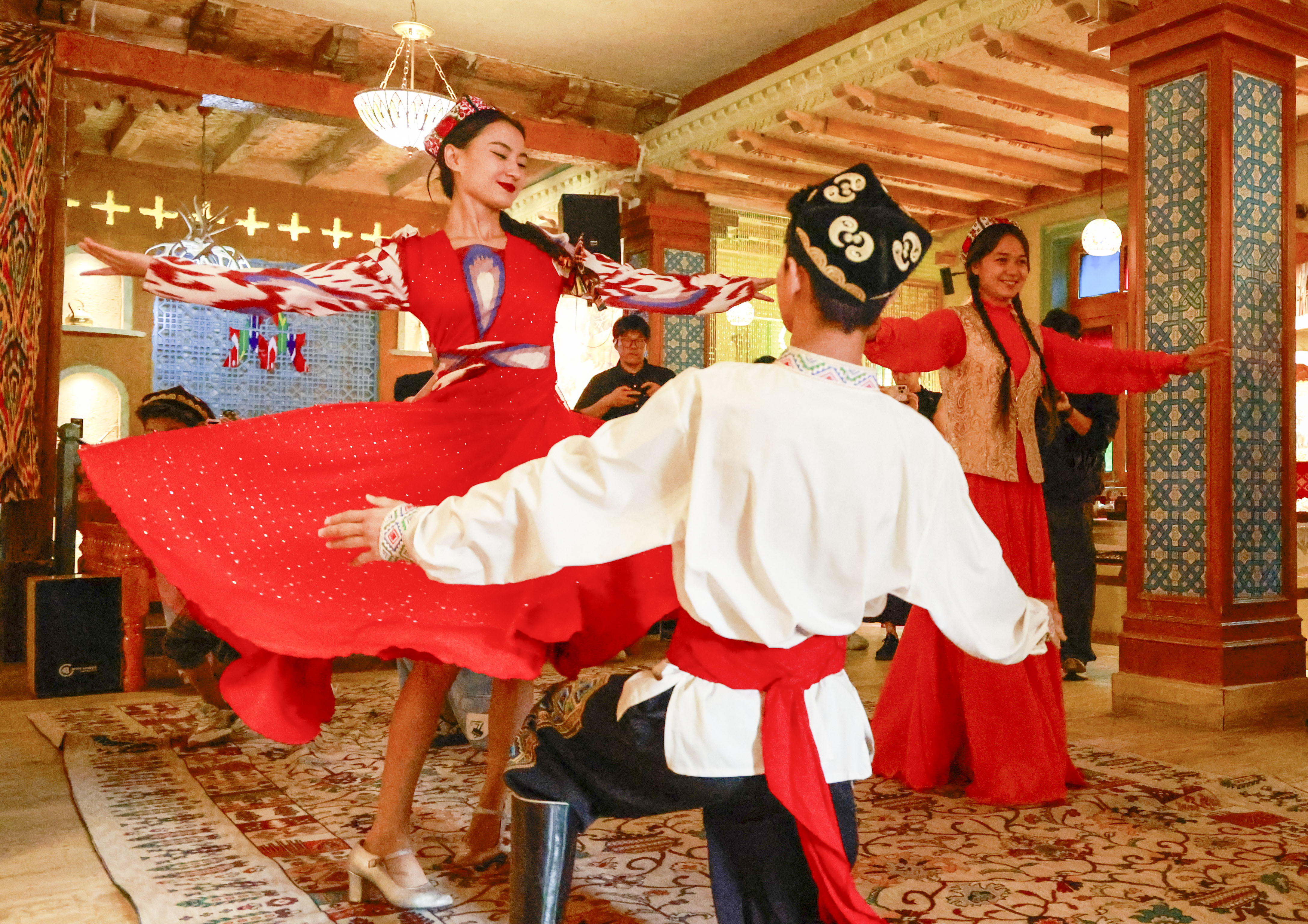 8月14日,在新疆和田市团城的一家特色店铺内,演员为游客表演舞蹈。