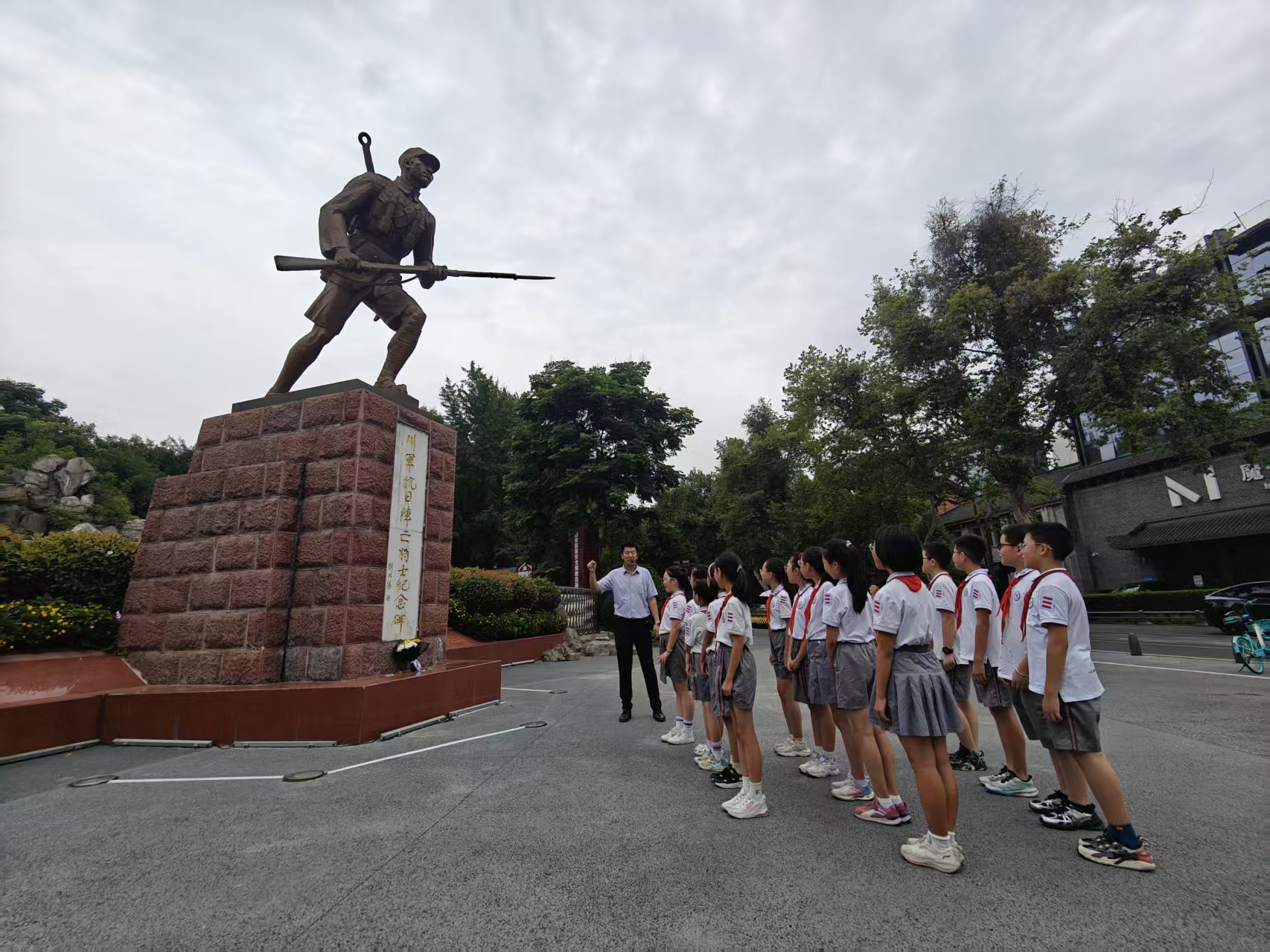 石室联合中学蜀华分校师生在川军抗日阵亡将士纪念碑前缅怀先烈(6月20日摄)。 新华社记者 谢 佼 摄