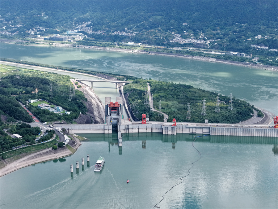 8月16日,在湖北省宜昌市,游轮长江三峡5号驶向三峡升船机。