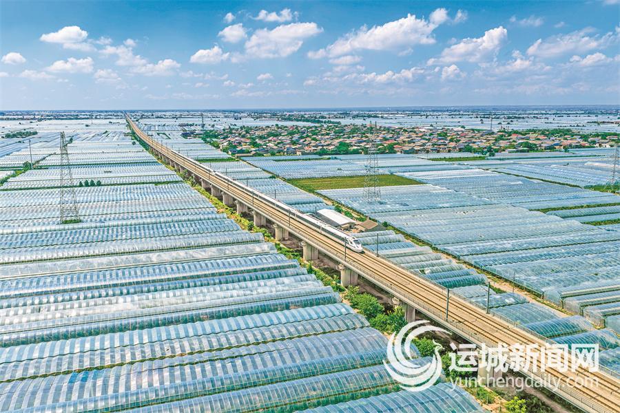 8月16日,一列高速列车沿大西高速铁路从临猗庙上乡万亩冬枣大棚间呼啸而过。设施大棚像“琴键”般整齐排列,与高铁、公路、村庄交相辉映,构成一幅充满活力的乡村美景图。特约摄影 杨建峰
