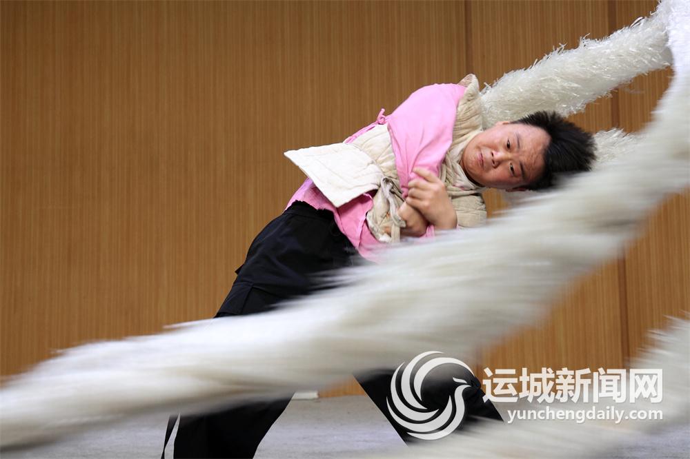 近日,运城学院的排练舞台上,跟随一阵紧似一阵的“人声锣鼓”点,身背白色纸幡的李志辉“起霸”之后,便开始了一整套程式化动作:跪甩前后,慢三下,快五下;左右甩八下,大甩腰六下……3米多长的纸幡四面翻飞,让人眼花缭乱,叹为观止。李志辉则目光如炬,挥汗如雨,一招一式有板有眼。