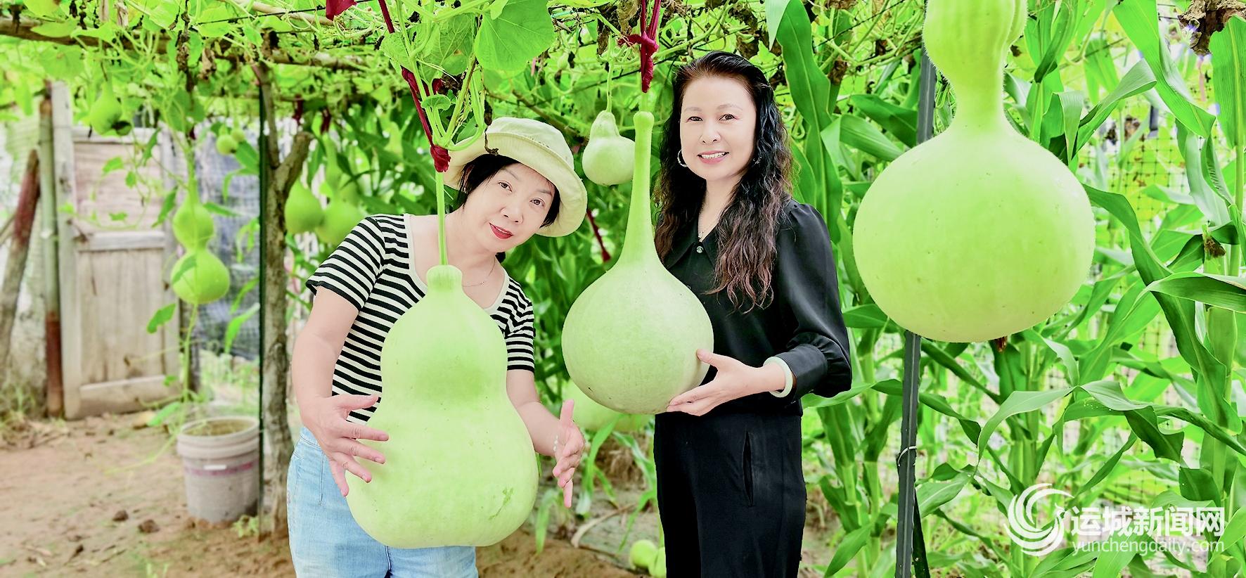 8月24日,陕西渭南两名游客慕名来到夏县禹王镇东浒村郑富中的葫芦种植基地,参观他培育的特大葫芦。