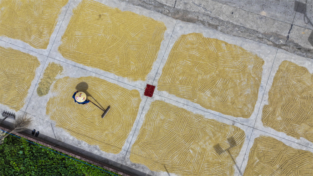 8月24日,在湖南省常宁市洋泉镇,农民在晾晒稻谷(无人机照片)。 新华社发(周秀鱼春 摄)