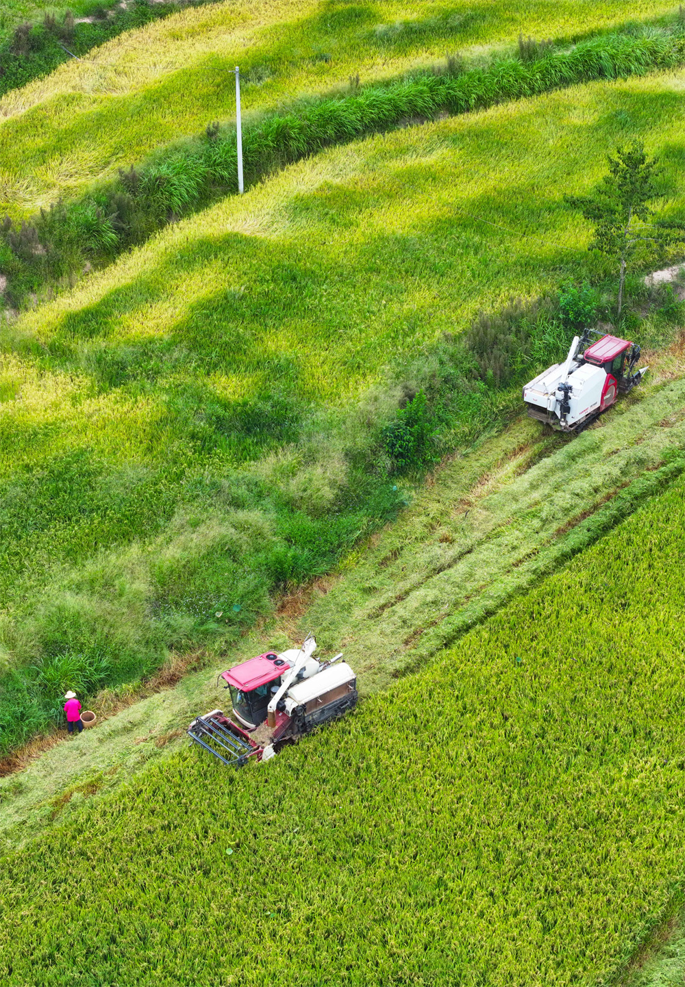 8月23日,在重庆市梁平区礼让镇新华村,农民驾驶收割机收割稻谷(无人机照片)。新华社发(刘 辉 摄)