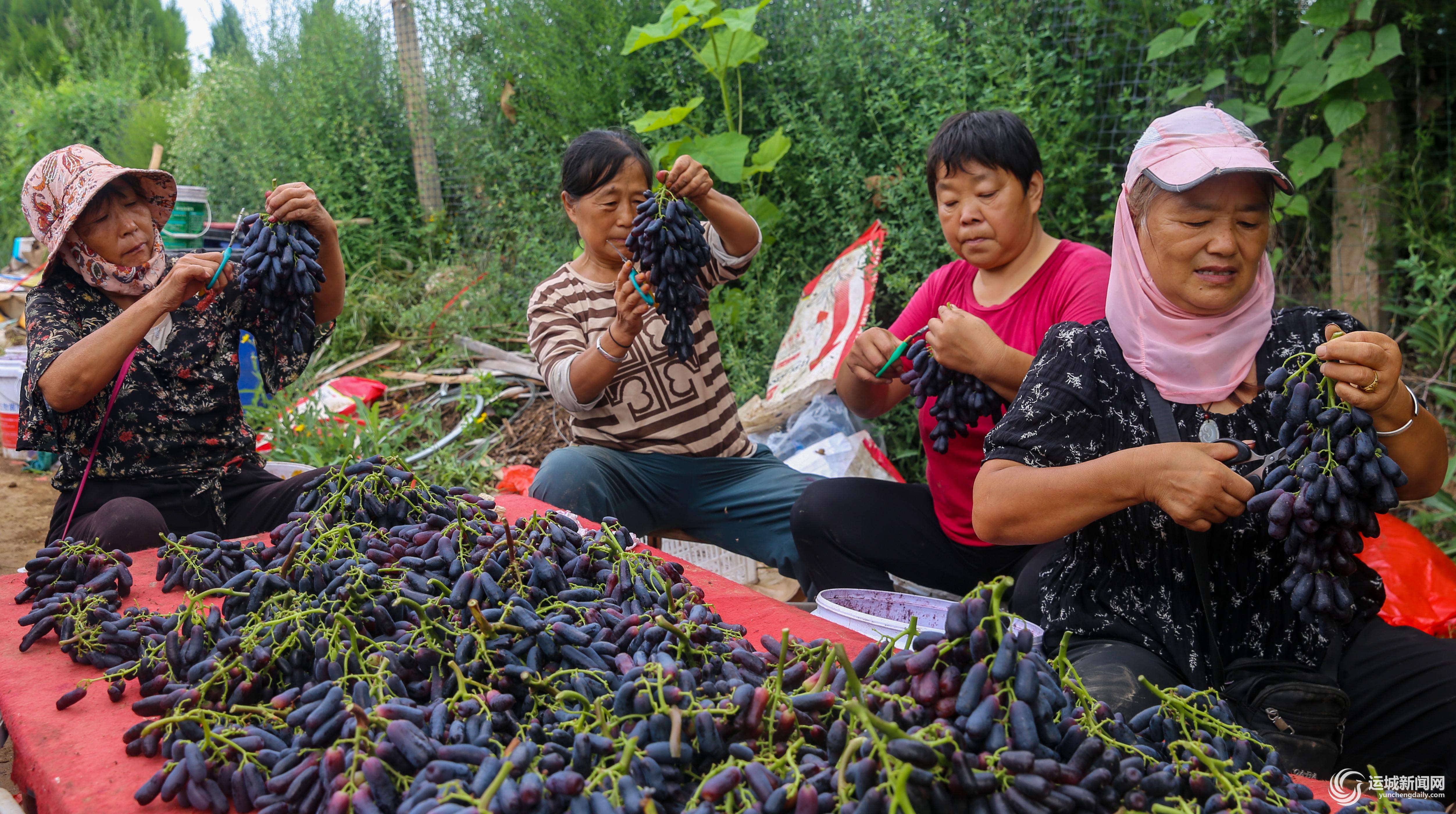 8月23日,夏县尉郭乡尉郭村,村民将采摘好的蓝宝石葡萄进行分拣、装筐,供应省内外市场。