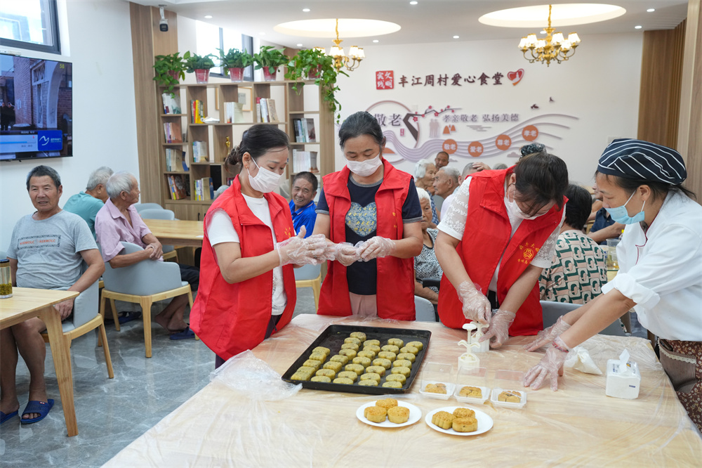 8月26日,在安华镇丰江周村爱心食堂,志愿者做药膳月饼给老人品尝。