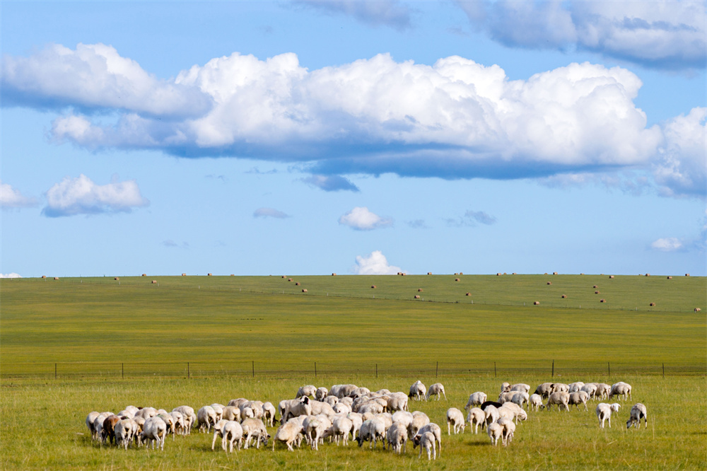 初秋时节,呼伦贝尔大草原草色渐黄,成群的牛羊、马匹漫步其间,勾勒出一幅祥和美丽的秋日丰收图景。