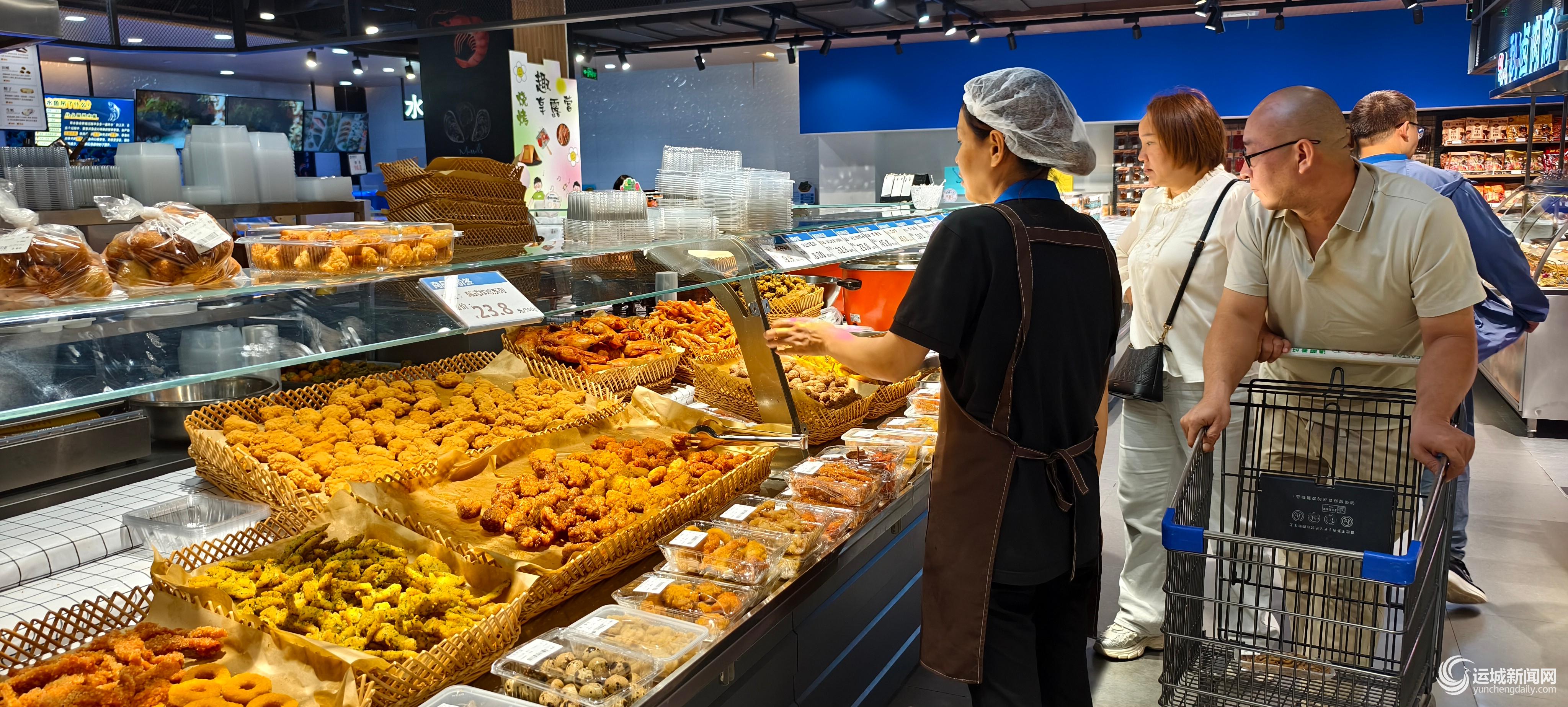 夜幕降临,时针指向晚上8点,东星超市的生鲜区、熟食区却迎来了一天中的消费小高峰。在蔬菜区,紫莹莹的茄子、鲜嫩的黄瓜、黄澄澄红艳艳的菜椒等换上了新价签,原价20元一袋的贝贝南瓜也是半价出售,存放时间较短的绿叶菜都被挑出来放进手推车里供消费者选择;水果区里,搭配好的“组合果盒”,原价20元的,现在8元就能拿下;炸货区的小酥肉、鸡米花、干炸小黄鱼等被分装成小份,13元就能带走两盒;卤肉柜台前,酱猪耳、卤鸡腿被精致地装在透明盒里,一口价的优惠让不少顾客驻足……