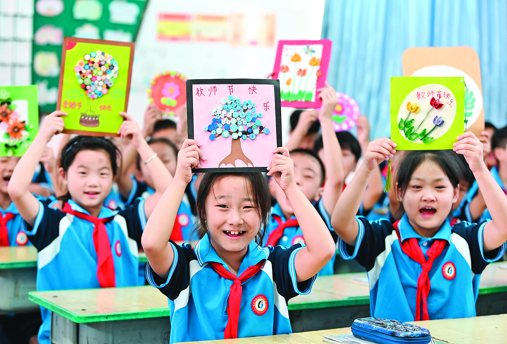 9月9日,山东省滕州市鲍沟镇中心小学学生展示即将送给老师的手工作品。