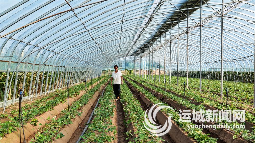 9月13日,永济市栲栳镇青台庄村设施农业基地内,工作人员在查看新栽的奶油草莓幼苗生长情况。