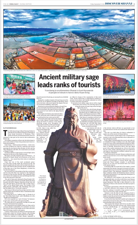 本报讯(记者 赵卓菁)9月19日,《中国日报》以整版篇幅通过图文并茂的专题报道形式,预告了即将于9月23日开幕的山西运城第36届关公文化旅游节相关信息,介绍了古老河东厚重的文化底蕴。