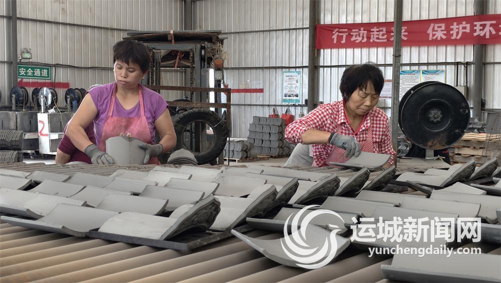 厂区内砖瓦、猫头、滴水、兽脊等整齐码垛,车间里各工序有条不紊地紧张进行。设备操作员王学伟是六毋村村民,干这行已有10年,平时上下班骑电动自行车只需10分钟。“现在的工作条件更好,资源利用率高,就近就业就能养家糊口,我很知足。”王学伟说。