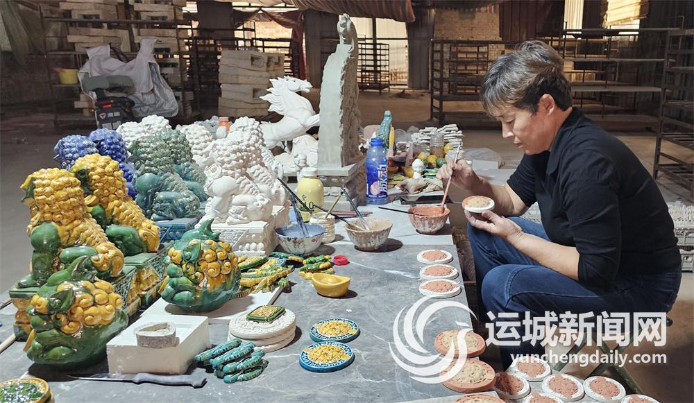 距离山西舜博园林古建工程有限公司不远,是山西晋飞云琉璃制品有限公司,工作人员介绍:“我们门楼上的琉璃,40多年了,色泽还这么好。”阳光下的琉璃瓦、檐角等,像给门楼披上了时光淬炼的彩衣,灵动而有生命力。各式各样的产品整齐码放,烧制车间的工人忙碌地进行一场场“泥土的涅槃”。