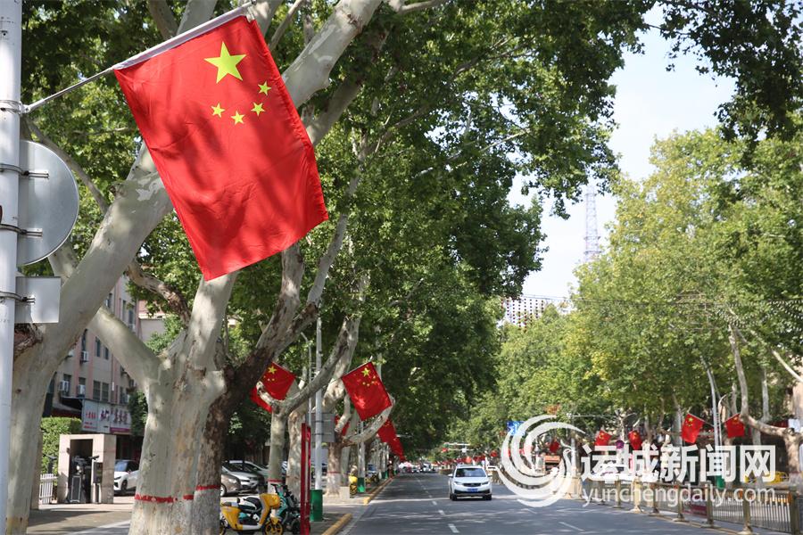 9月29日,一面面鲜艳的五星红旗飘扬在永济街头,营造出浓浓的节日氛围。 特约摄影 薛启涛
