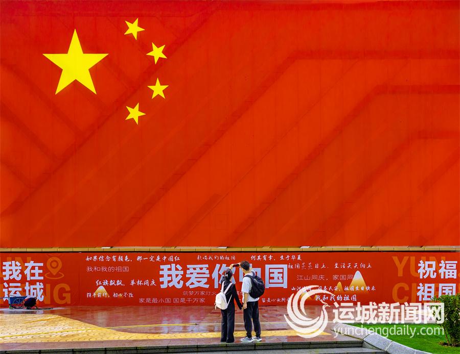 9月30日,在运城市中心城区禹西路,一面悬挂在墙上的巨幅国旗吸引市民纷纷驻足拍照打卡。