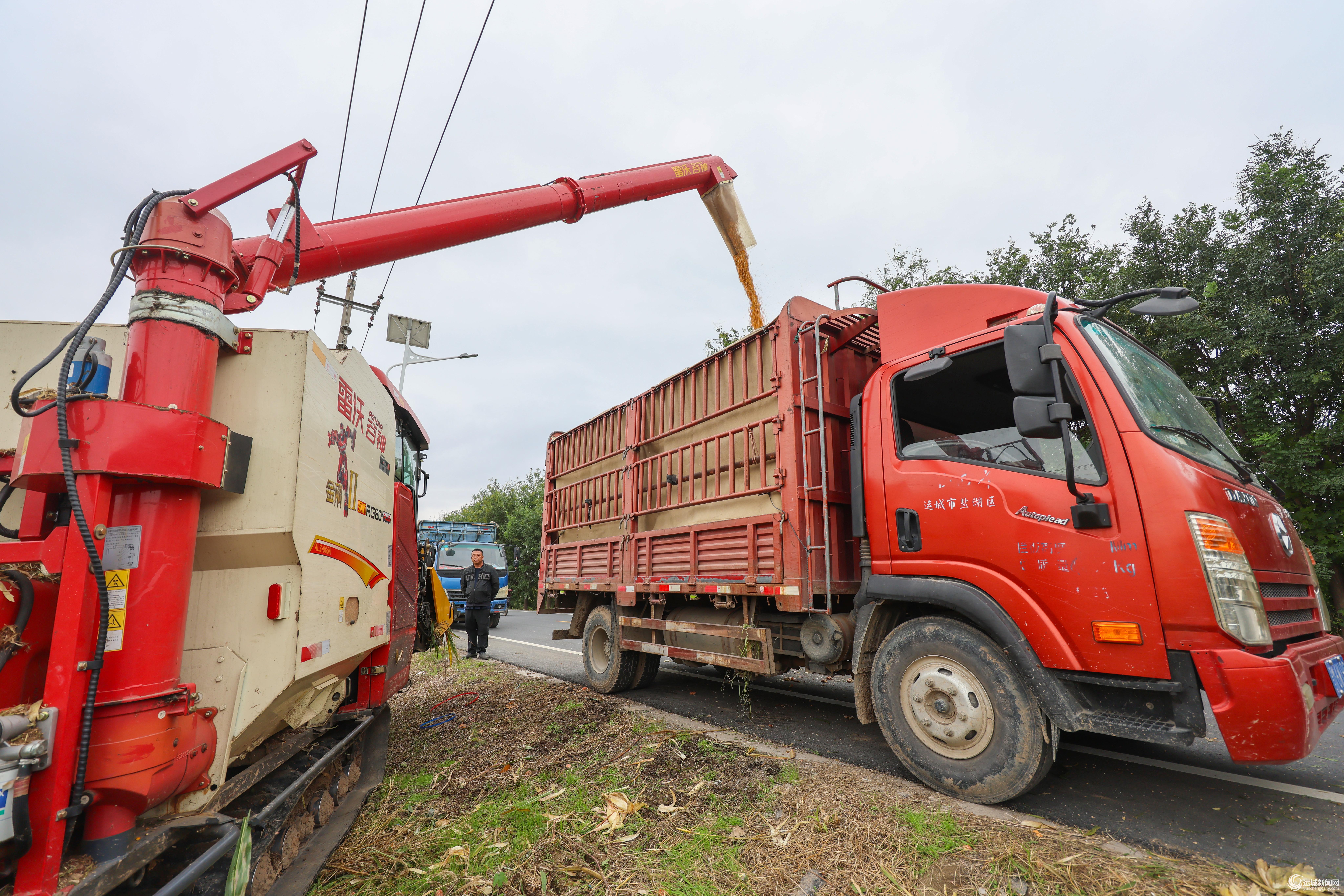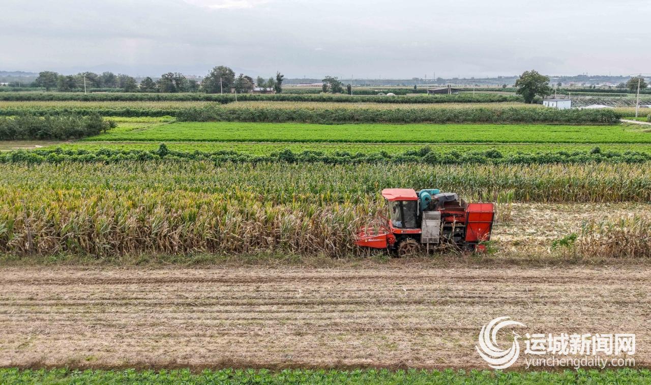 10月10日,大型联合收割机在盐湖区北孙坞村田间抢收玉米。
