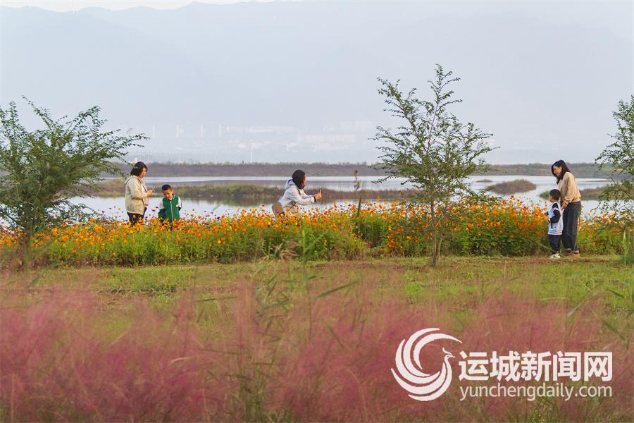 10月13日,游客在运城盐湖景区赏花游玩。运城盐湖景区彩虹路两侧各种盛开的花卉在阳光的映射下显得分外迷人,吸引众多游客前往游玩打卡。