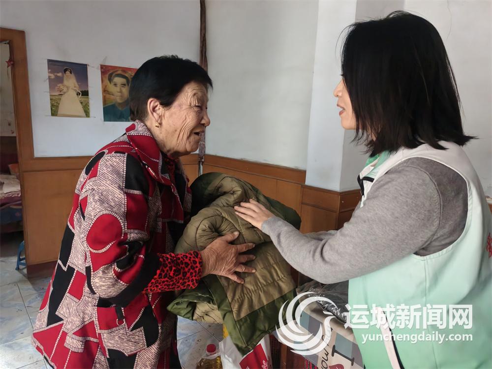“最近降温了,这是给您送的棉衣,您试试合不合身?”当天下午,盐湖区民政局工作人员、社工与志愿者组成的慰问小组,带着面粉、食用油、棉衣等物资,走进上郭乡5户困难家庭,开展精准帮扶。