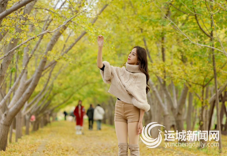 10月18日,游客在临猗县三管镇卓氏银杏源家庭农场赏景游玩。