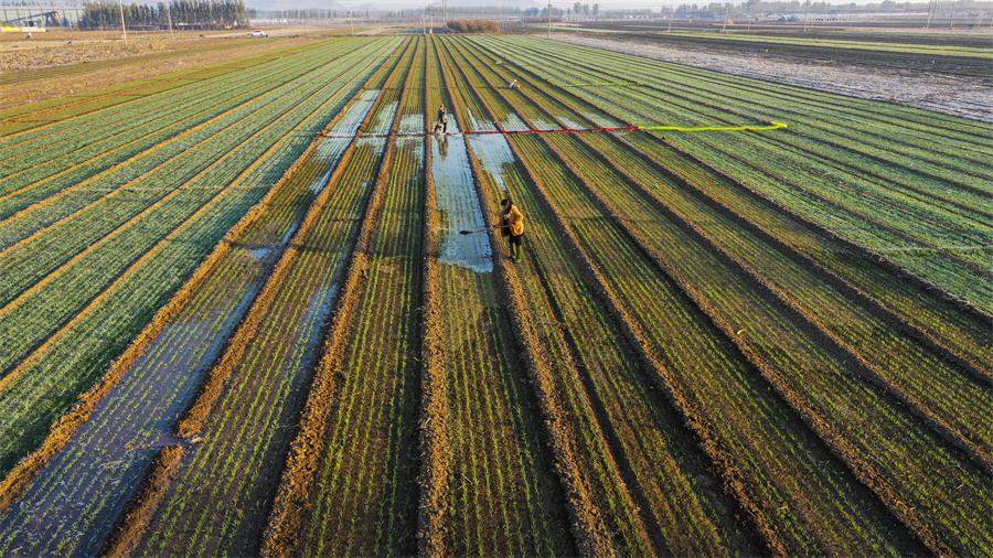 11月3日,河北省遵化市东新庄镇农民在麦田浇水。 新华社发(刘满仓 摄)