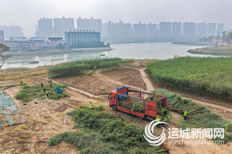 深秋的安邑水库,施工人员积极开展绿植栽种作业,加紧实施运城市官道河生态修复与整治工程(10月31日摄)。