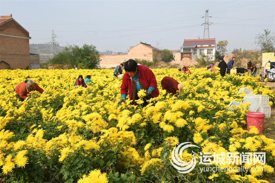 11月4日,闻喜县桐城镇下白土村金丝皇菊种植基地的菊花田里,金灿灿的菊花竞相绽放,村民们忙着采摘。