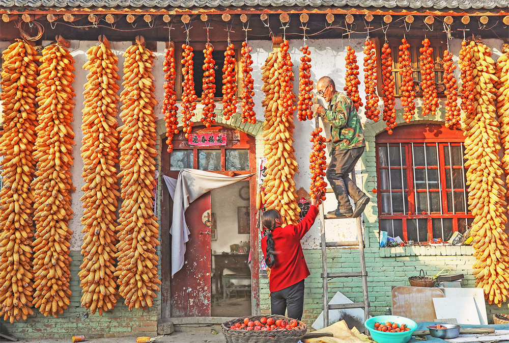 深秋时节,该县许多农户不误农时,一边收获晾晒玉米,一边加工柿饼,处处丰收景象。 特约摄影 鲁国林