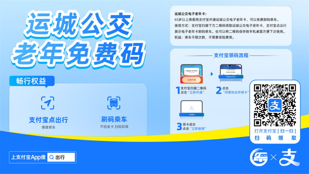 运城晚报讯(记者 赵泽艳)近日,运城公交联合支付宝推出“老年码”服务,盐湖区户籍年满65岁及以上的老人申领成功后,可凭码免费不限次数乘坐市内公交,享便捷出行福利。