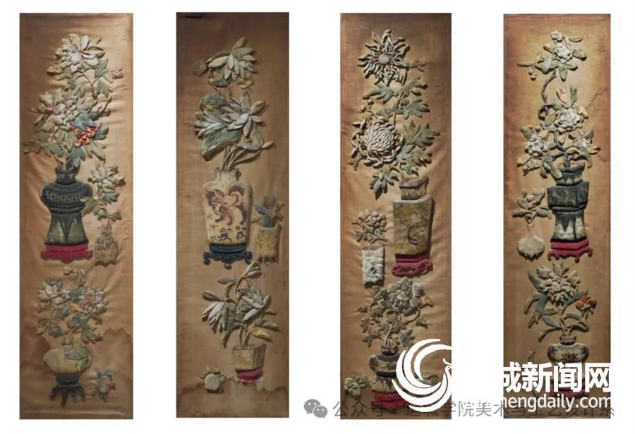 另一组清代春夏秋冬四条屏,以立体堆锦技法塑造出牡丹、荷花、菊花和梅花的四季之美。不同层次的布料堆叠和色彩搭配,让瓶花主题呈现出丰富的立体感和层次感,传递出富贵、高洁、坚韧的美好寓意。