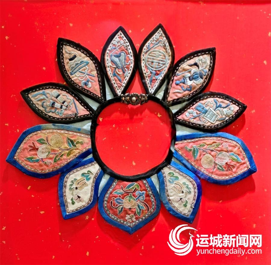 展厅中,特别引人注目的是几件历经岁月洗礼的清代刺绣珍品。一件清代刺绣云肩由多片花瓣状绣片组成,围绕领口如花朵般绽放,绣片上精细地绣着琴棋书画、石榴、寿字、博古等吉祥图案。在红、蓝、粉、白等鲜艳色彩的映衬下,这件可能曾属于小孩子的服饰配件,依然诉说着当年的吉祥、富贵寓意。一件工艺精湛的作品,以“荷花”为主题纹样,采用传统打籽绣针法,针法更具立体感、坚固耐用,作品象征高洁、吉祥、和谐,寓意家庭和睦、万事兴隆。