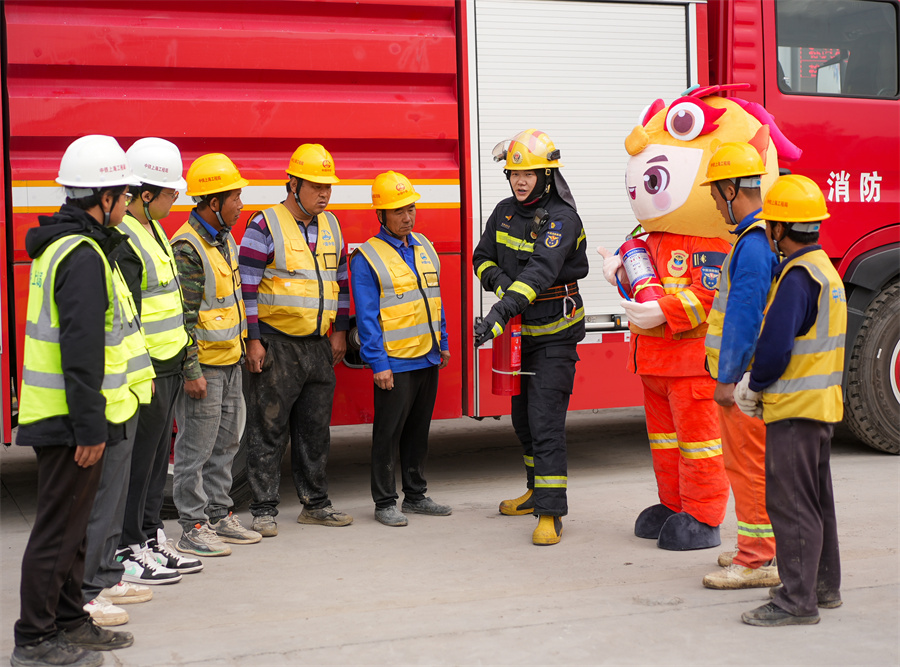 11月7日,在位于江苏省兴化市陈堡镇的中铁上海工程局盐宜铁路项目部工地,兴化市消防救援大队消防员指导工人正确使用灭火器。