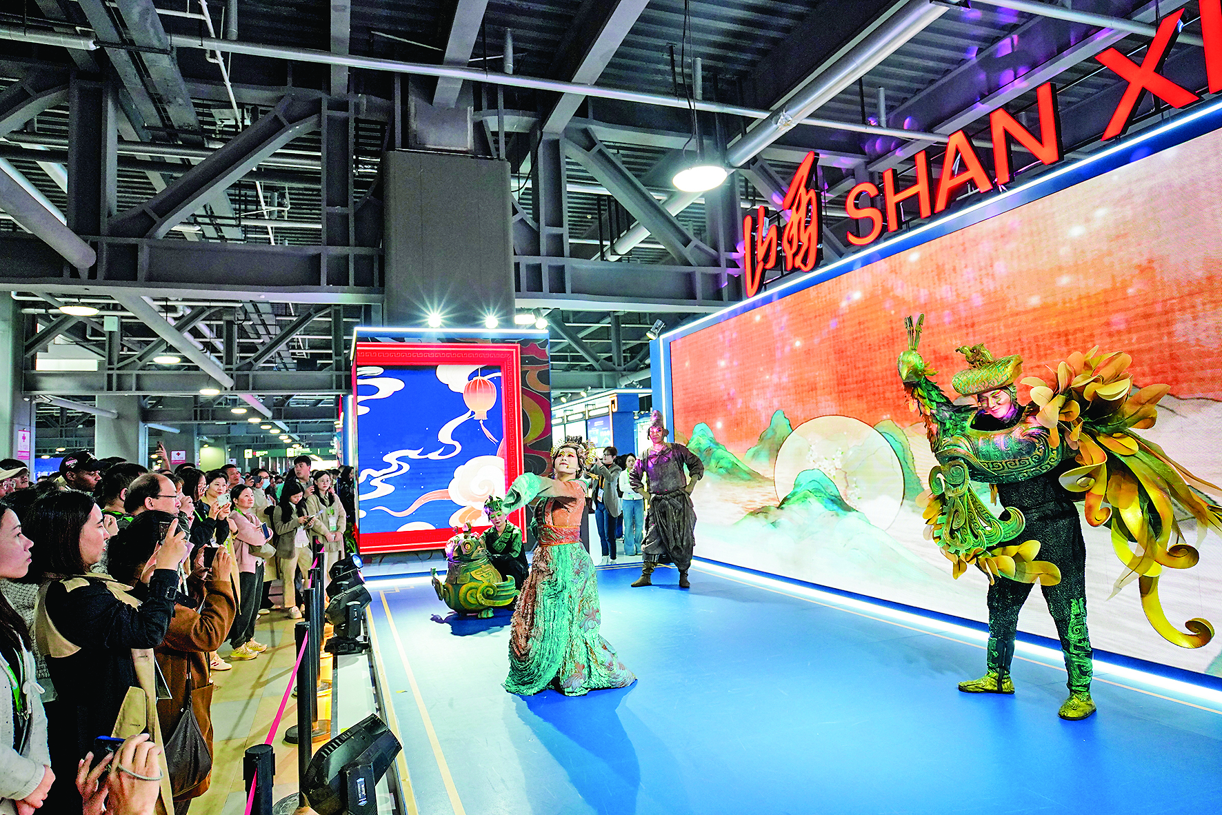 11月8日,参观者在第八届进博会山西展厅观看表演。
