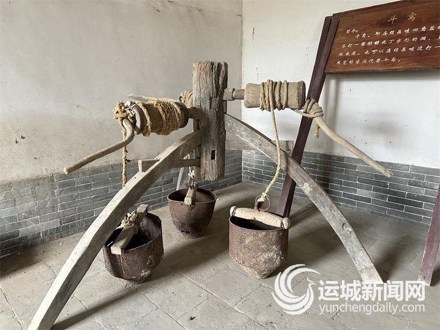 房内陈列着一木支架,旁有标识介绍。清光绪六七年间(1880~1881),首次在盐湖东南部土质比较坚硬的地区凿井。井边初用四角方木支架加固,后改成六角形支架,所凿井得名“木盘井”。它是世界盐湖固相矿床采用凿井法、井组连通法水溶开采的最早例证,用来抽取深层高浓度含矿卤水,与盐湖水调配使用。