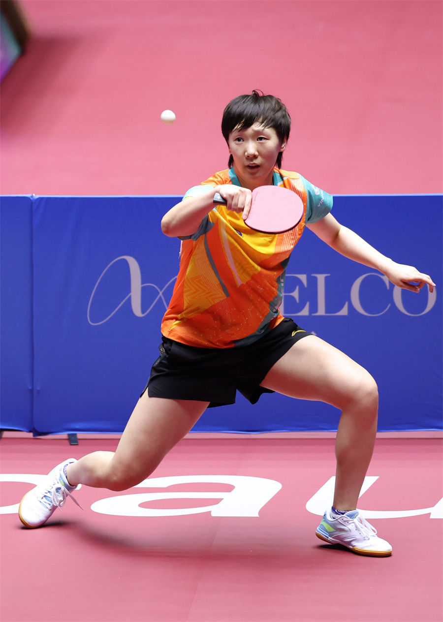 11月11日,黑龙江队选手王曼昱在比赛中回球。当日,在澳门举行的第十五届全国运动会乒乓球女子单打十六分之一决赛中,黑龙江队选手王曼昱4比3战胜山东队选手范思琦,晋级下一轮。