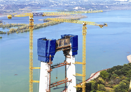 11月9日,国道209王官黄河大桥建设工地一派繁忙景象,施工人员正在对主塔塔柱进行混凝土浇筑作业。