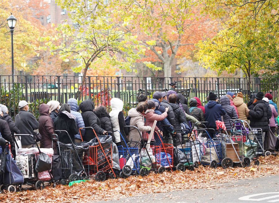 11月12日,人们在美国纽约一处食物发放点领取食物。