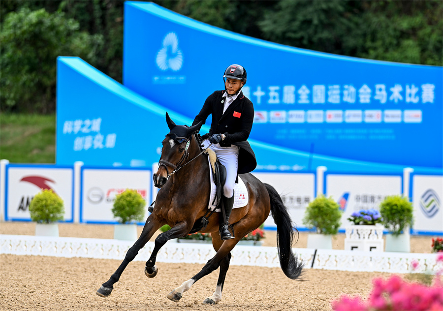 11月13日,广东队选手梁锐基和马匹“凯丽”在比赛中。他在个人赛中排名第一,广东队在团体赛中排名第二。当日,第十五届全国运动会马术三项赛团体赛决赛(个人资格赛)盛装舞步在广东深圳光明国际马术中心举行。