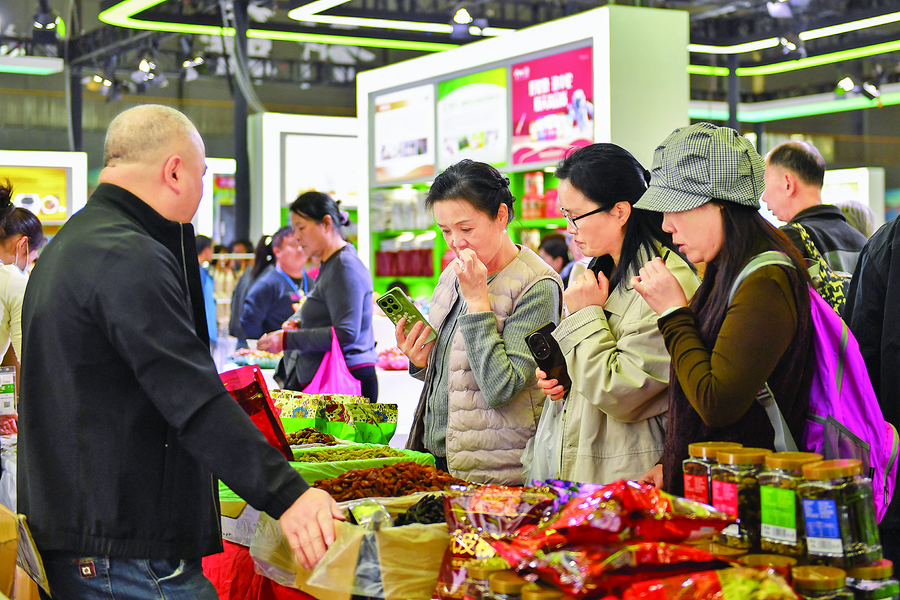 11月14日,观众(右)在第二十六届中国中部(湖南)农业博览会上挑选商品。
