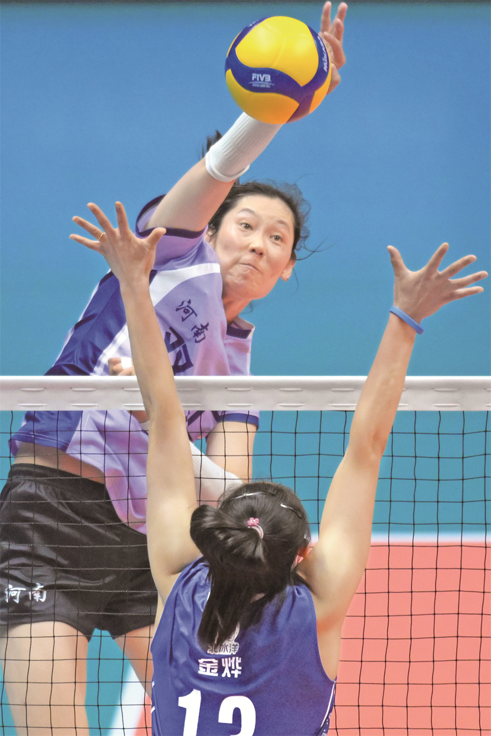 11月18日,河南队球员朱婷(上)在比赛中扣球。