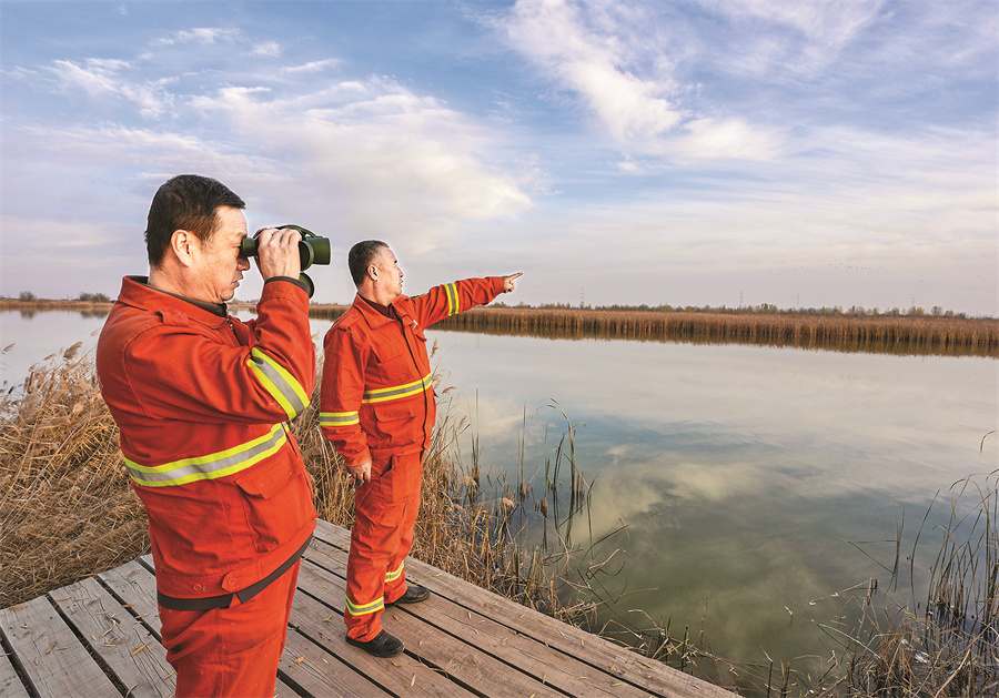 近日,工作人员在宁夏平罗天河湾国家湿地公园内观察候鸟。